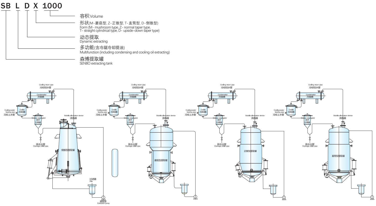 Upside-down taper type extracting tank The appearance is small at the top and big at the bottom, with the shape of upside-down taper.The most prominent features are convenient residue discharging and lower construction space. | Normal taper type extracting tank (traditional type) It takes smaller space, so it is widely used in extracting workshops. Bottom heating is provided on the residue discharging door, which makes the extraction of medicine materials more complete. |